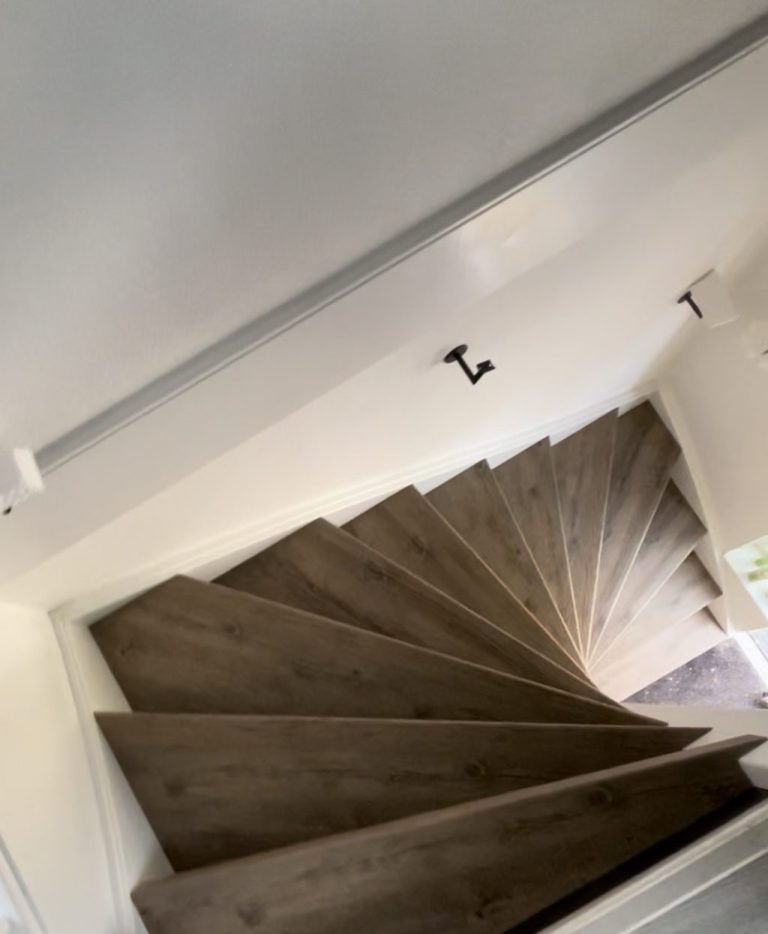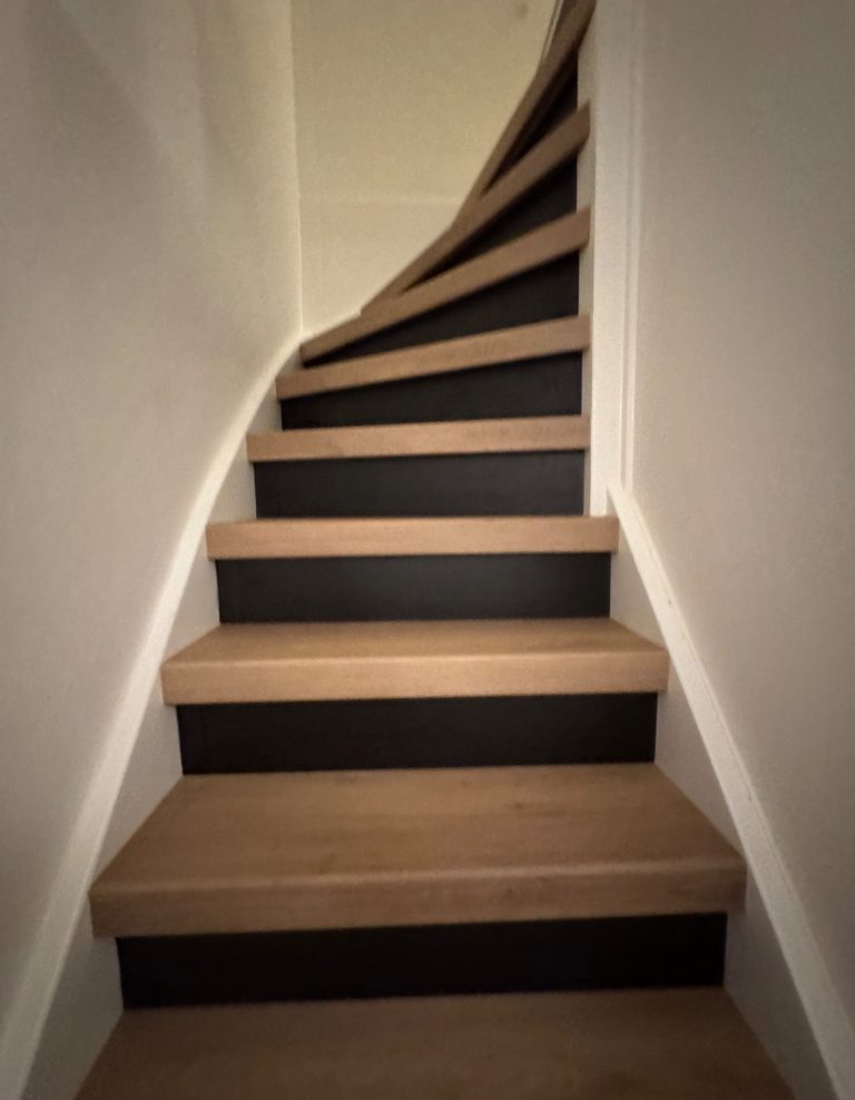Complete renovatie van een trap met 13 treden en één draai, inclusief montage en kwaliteitsmaterialen. Strak, duurzaam en stijlvol afgewerkt voor slechts €1650.